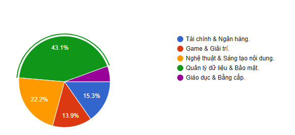 Niềm tin vào tương lai của công nghệ này là rất lớn. Khi được hỏi lĩnh vực nào sẽ bị thay đổi mạnh mẽ nhất bởi Blockchain trong 5 năm tới, đa số người tham gia (43.1%) chọn “Quản lý dữ liệu & Bảo mật”. Tuy nhiên, các lĩnh vực khác như “Game & Giải trí” (13.9%) và Nghệ thuật & Sáng tạo nội dung” (22.2%) cũng nhận được sự quan tâm đáng kể.