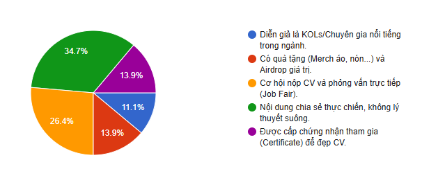 Đặc biệt, khi được hỏi về yếu tố tiên quyết để tham gia các sự kiện Roadshow của Bitget, 26.4% người chọn “Cơ hội nộp CV và phỏng vấn trực tiếp” và 34.7% chọn “Nội dung chia sẻ thực chiến”. Điều này một lần nữa khẳng định: Giới trẻ đang khát khao cơ hội việc làm thực tế.